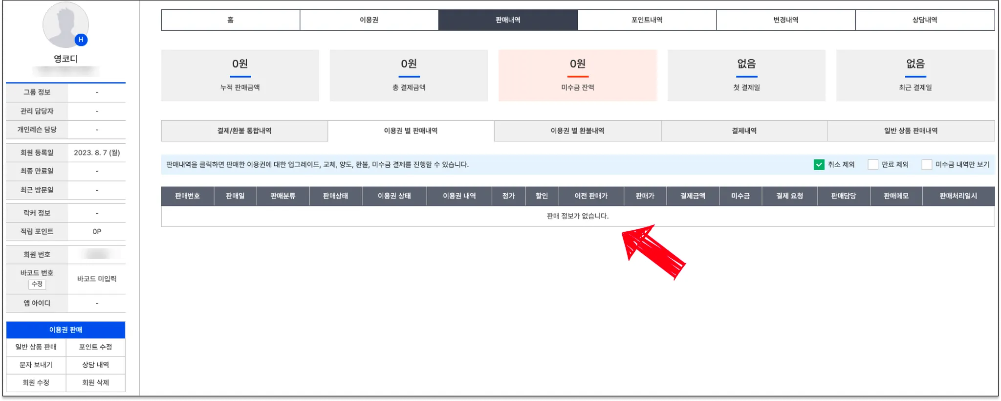 결제 내역이 없는 경우 회원 상세 > ‘이용권 별 판매내역’에 판매내역이 나타나지 않는 현상이 있었어요.