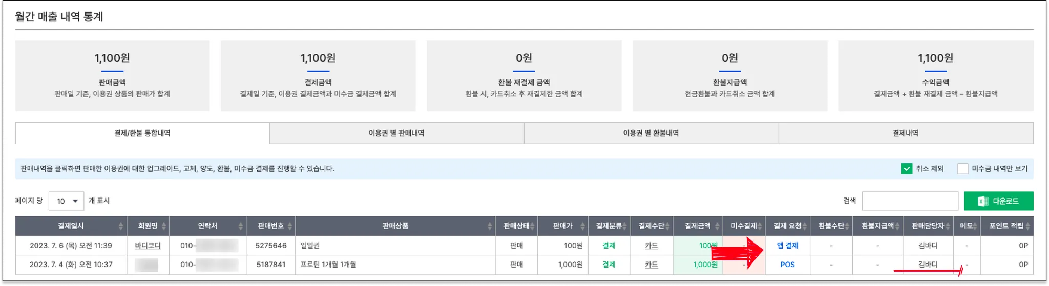 1. 회원상세 > 판매내역 및 회계관리에서 앱 결제 및 POS기 결제 시 판매담당자가 표시되도록 개선