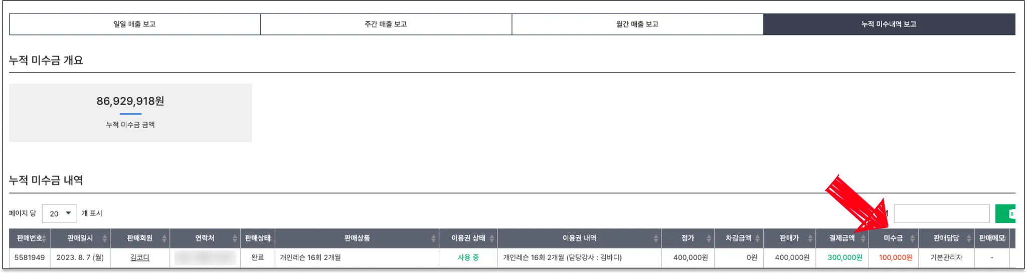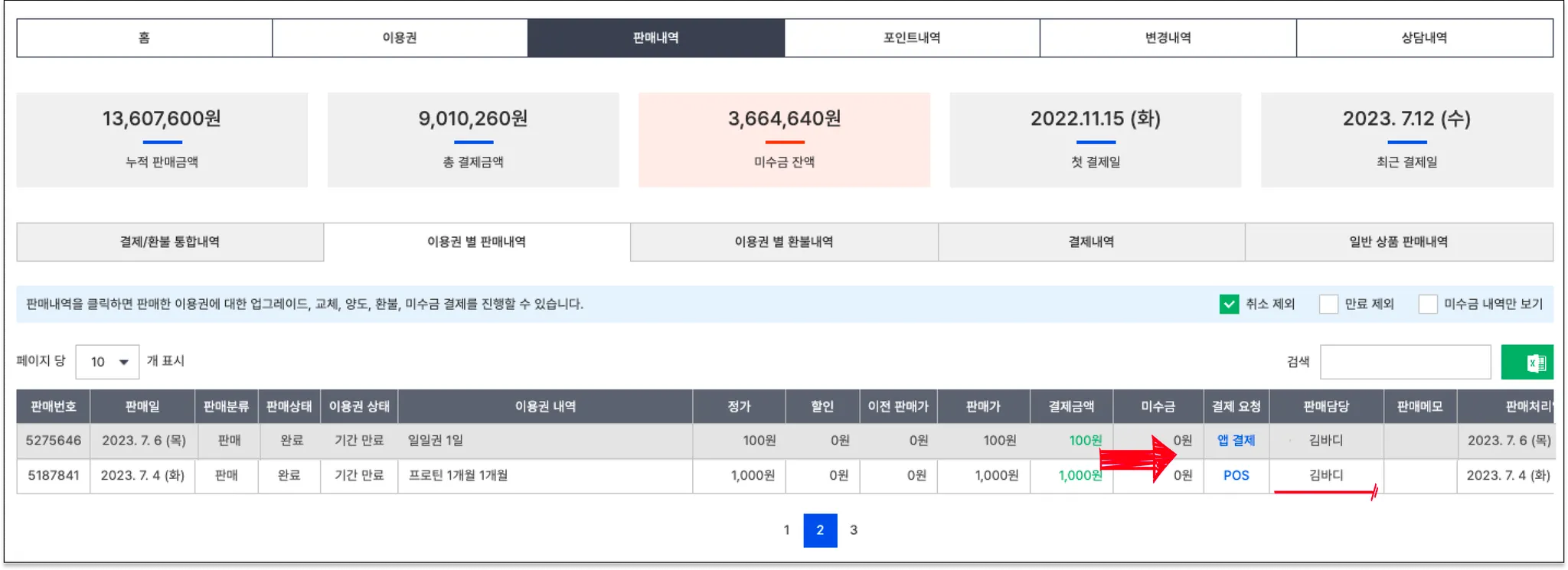 바디코디는 회원에게 이용권을 판매할 때, 미수금이 있다면 미수금 내역을 따로 확인할 수 있어요.