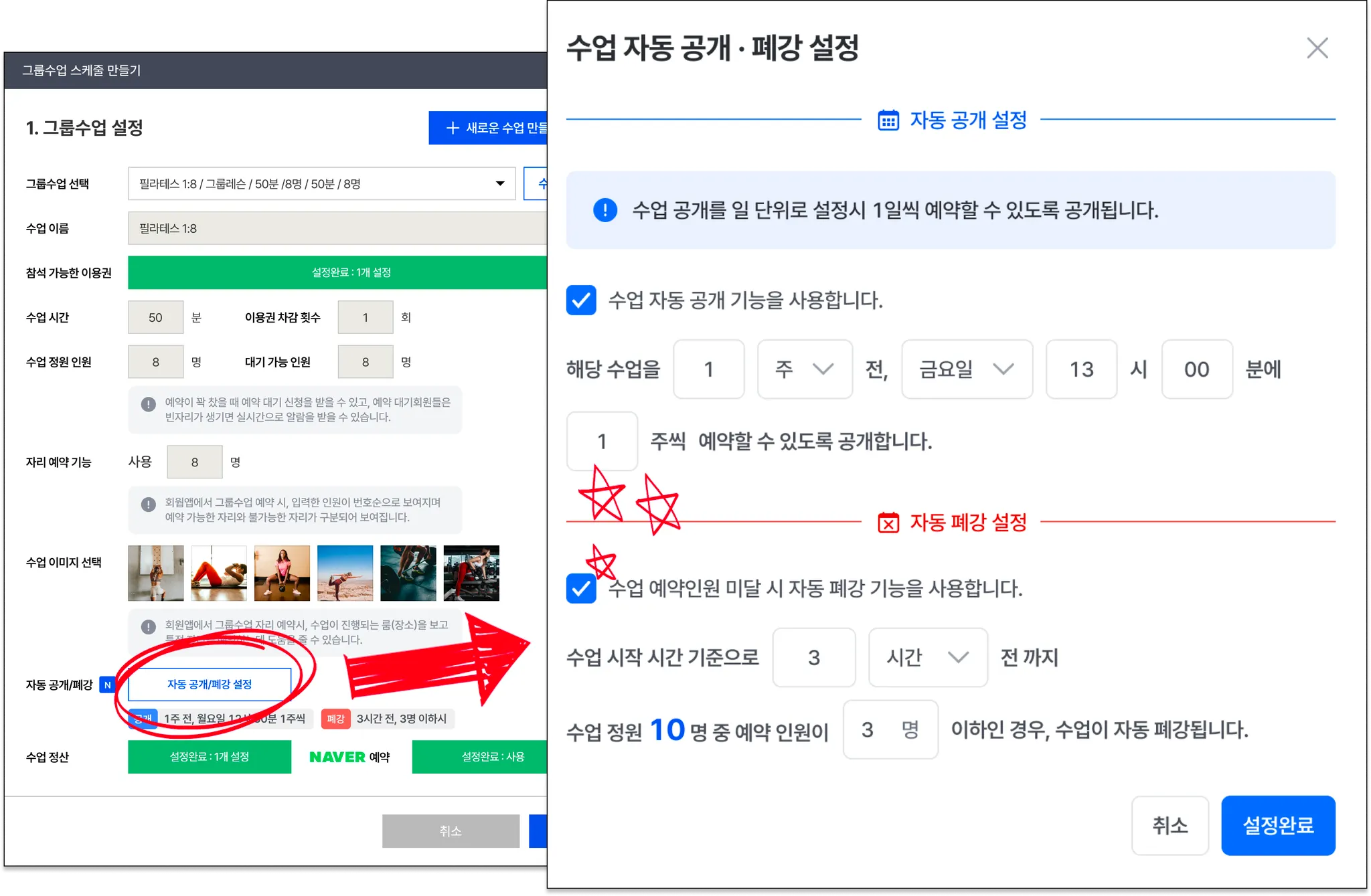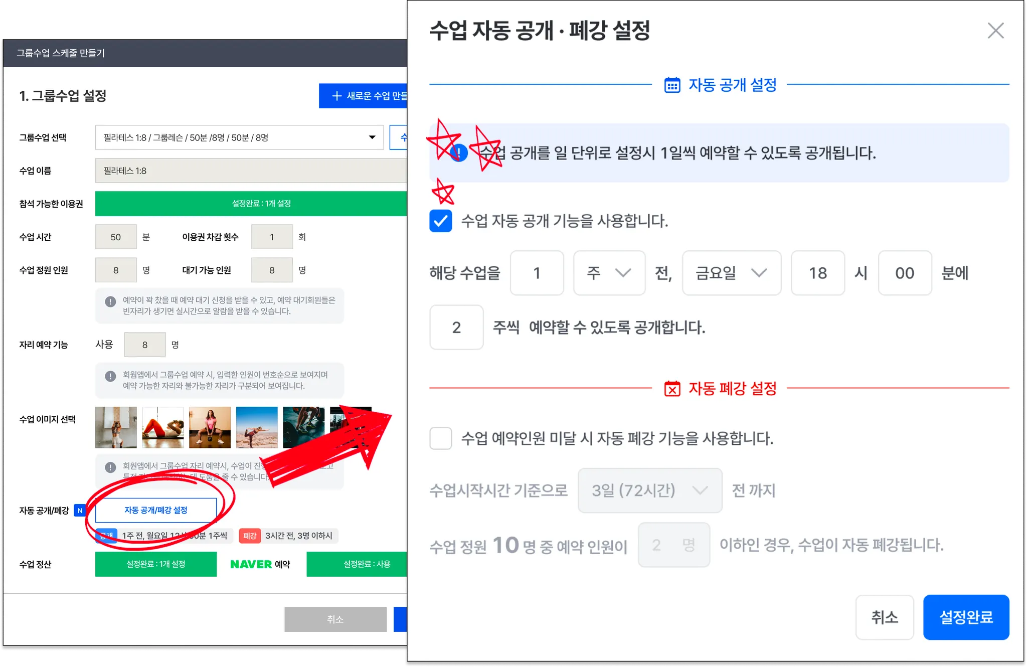 그룹수업 설정에서 자동 폐강 설정을 할 수 있어요.