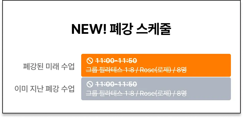 스케줄러에는 폐강된 수업이 별도로 표시되며, 회원앱, 강사앱, 관리자앱으로 알림까지 전달되니 스케줄을 일일이 확인하거나 따로 연락해야할 수고가 없어졌어요.