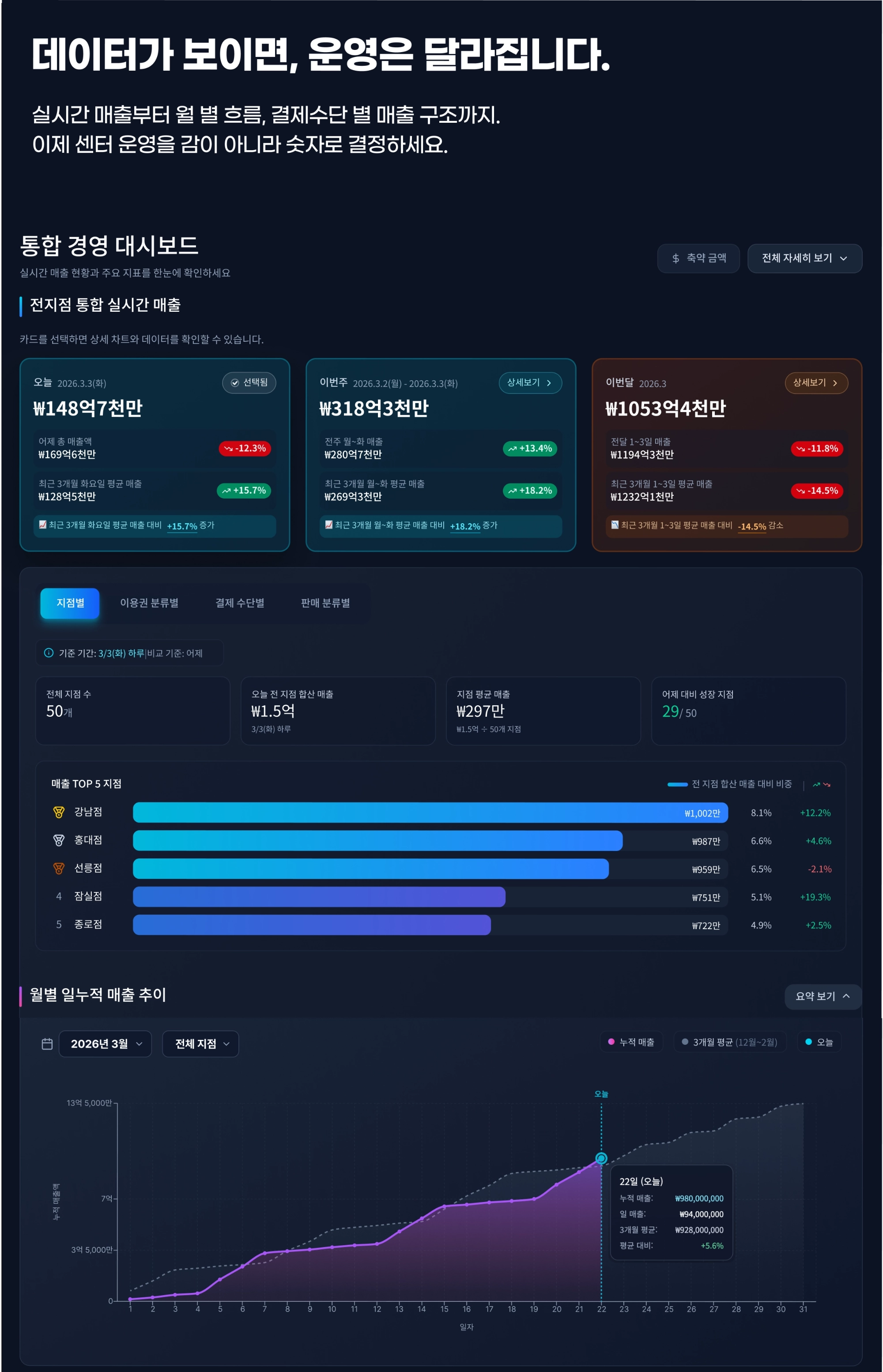 직관적인 매출 그래프와 꼭 필요한 지점 별, 기간 별 비교 데이터