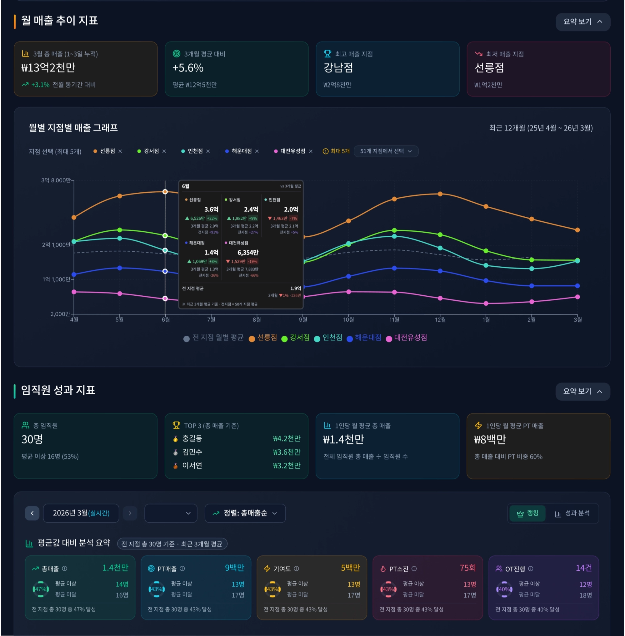 기간, 이용권, 결제수단, 직원 별 매출 데이터는 기본! 지점 별 비교 분석까지 가능해집니다!