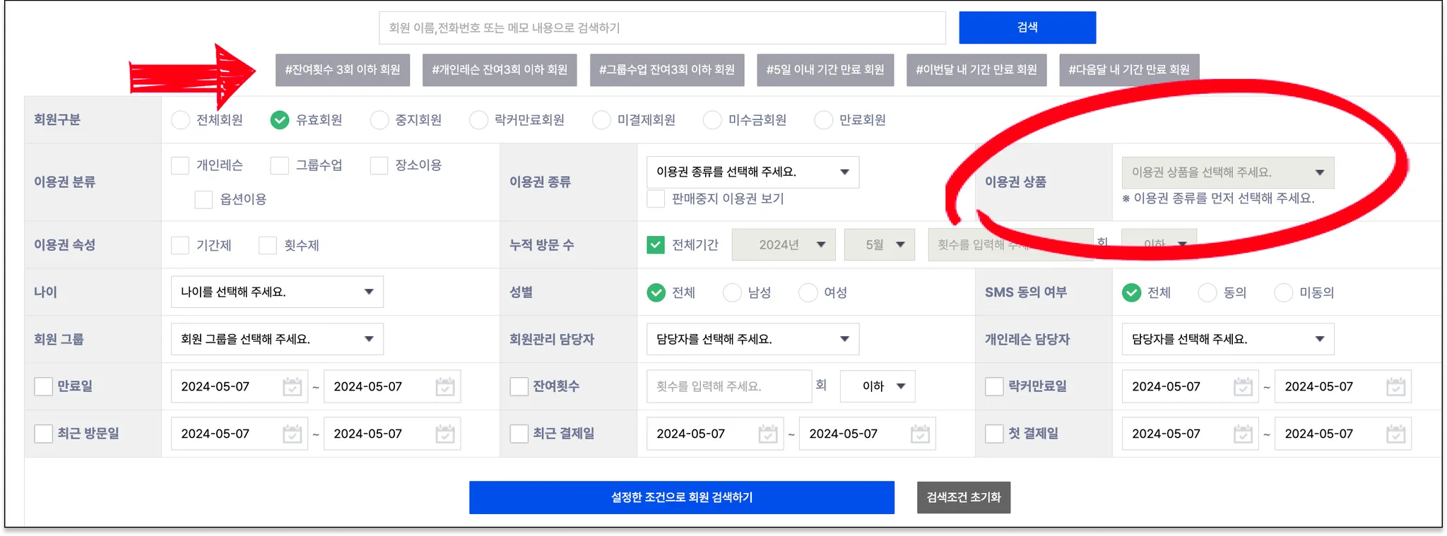 퀵 버튼으로 한 번에 회원을 검색하세요. 이용권 상품 별로 세분화하여 검색도 가능!