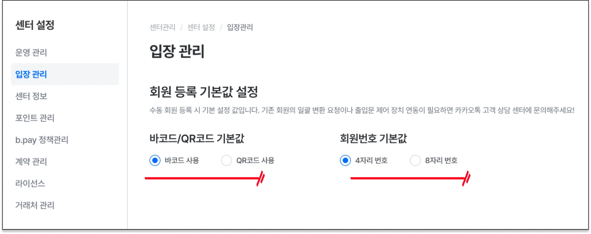 센터관리 > 센터설정 > 입장관리에서 바코드/QR코드, 회원번호의 기본 값을 선택해주세요.
