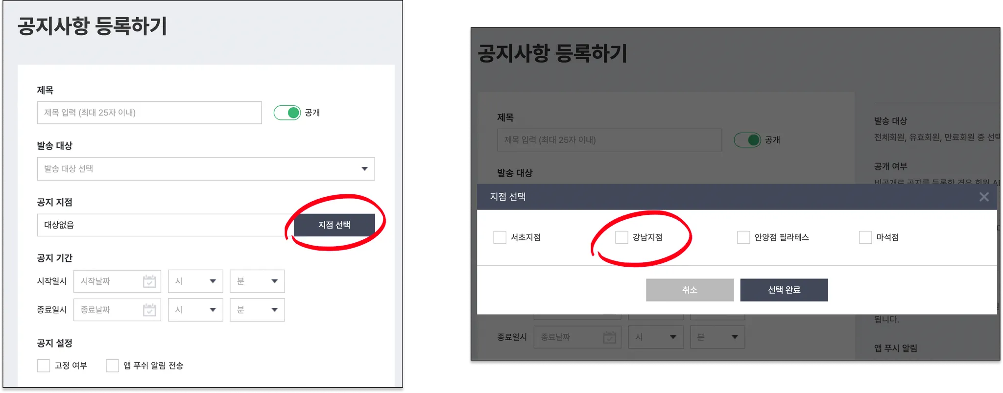 지점의 관리자가 지점을 선택하지 않고 공지사항을 발송하면, 다른 지점 회원에게도 공지가 발송되는 일이 빈번하게 발생하여, 실수를 방지하고자 공지사항 발송 시 발송 지점을 필수로 지정하도록 개선했어요.