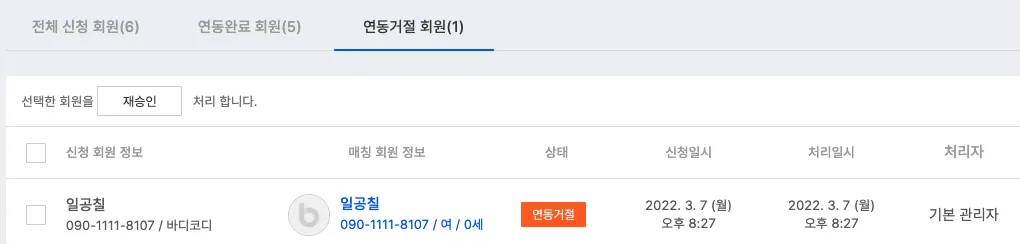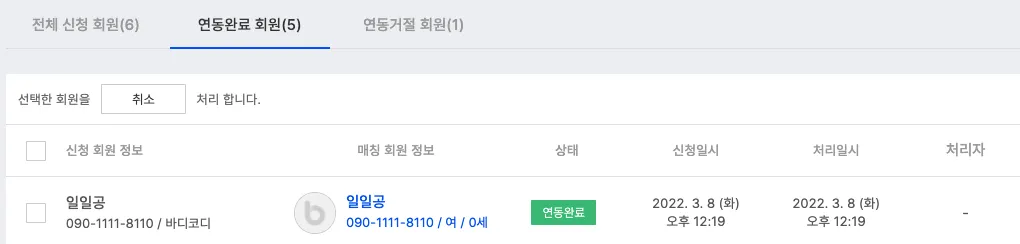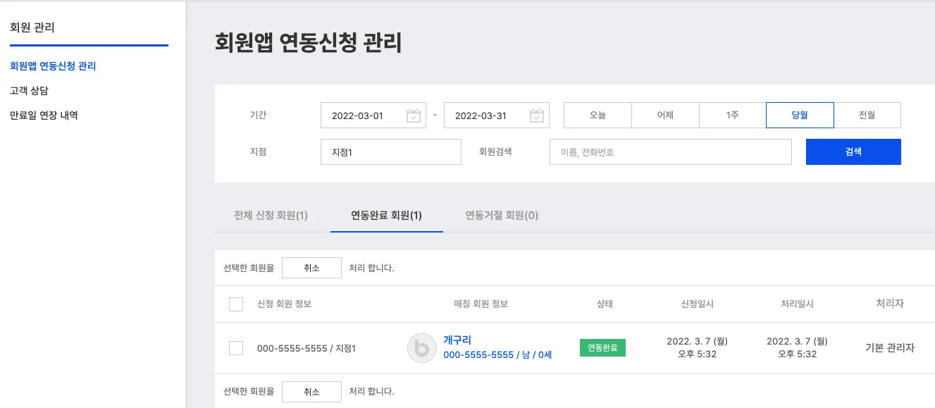 위의 이미지에서 ‘연동 완료’를 누르거나, ‘고객관리 > 회원관리 > 회원앱 연동신청 관리’ 에서 당월 연동 완료된 회원들의 목록 확인 가능
