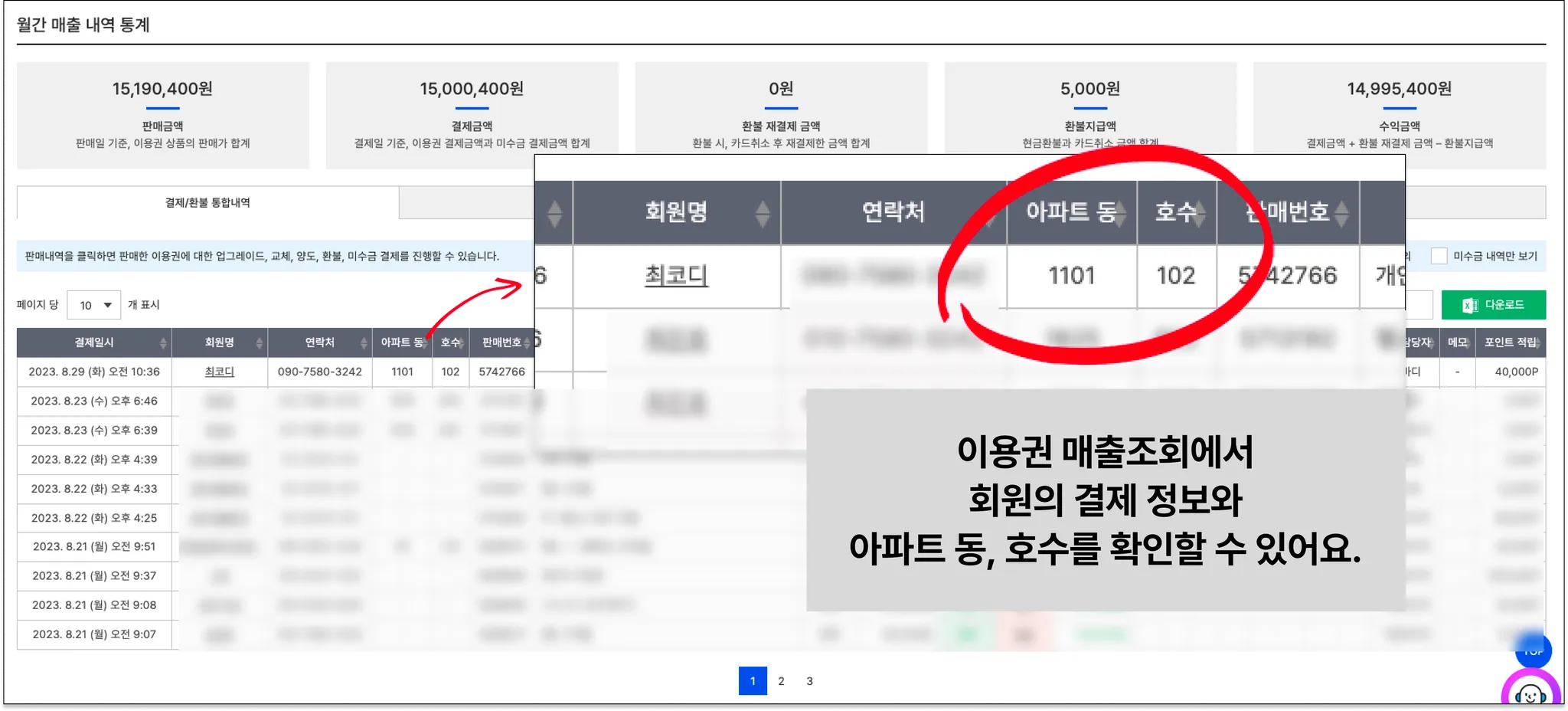 1. 이용권 매출조회에서 아파트 동, 호수 확인하기