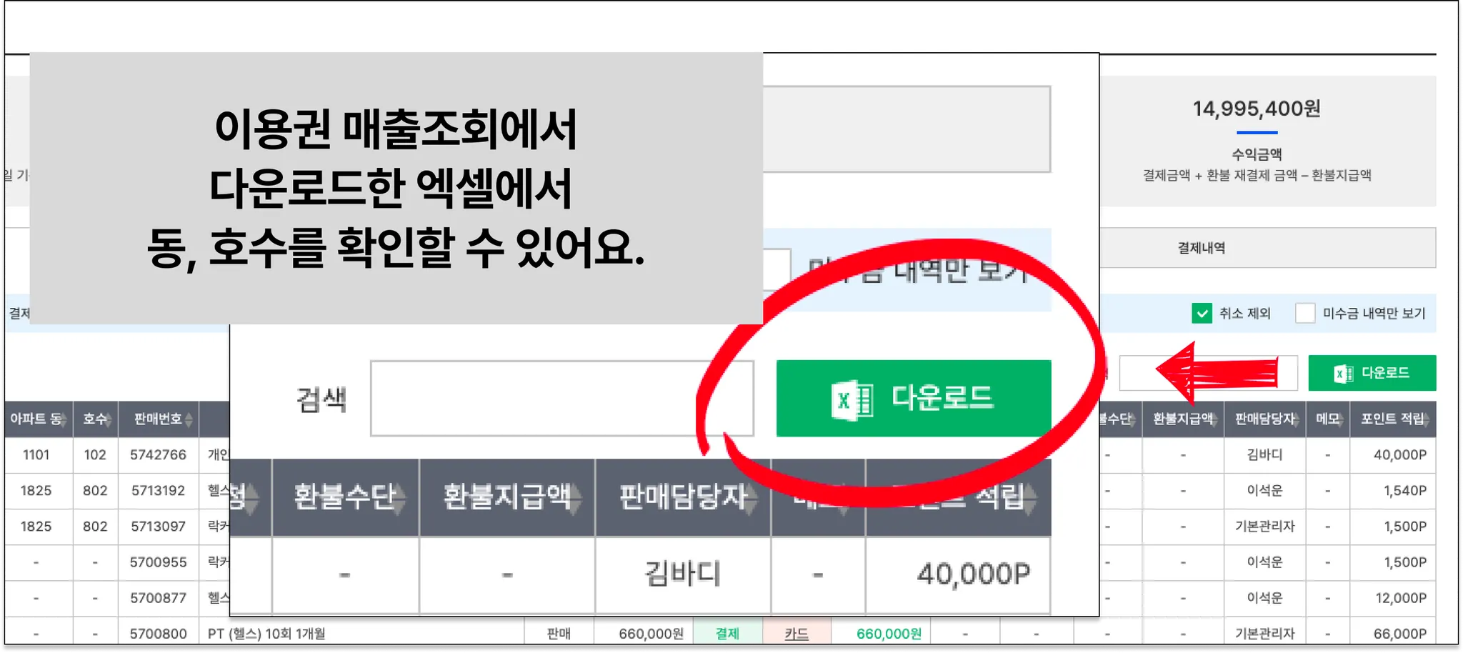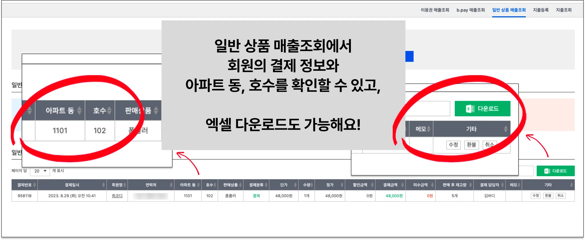 3. 매출 조회 시 아파트 동, 호수 확인 및 엑셀 다운로드 지원