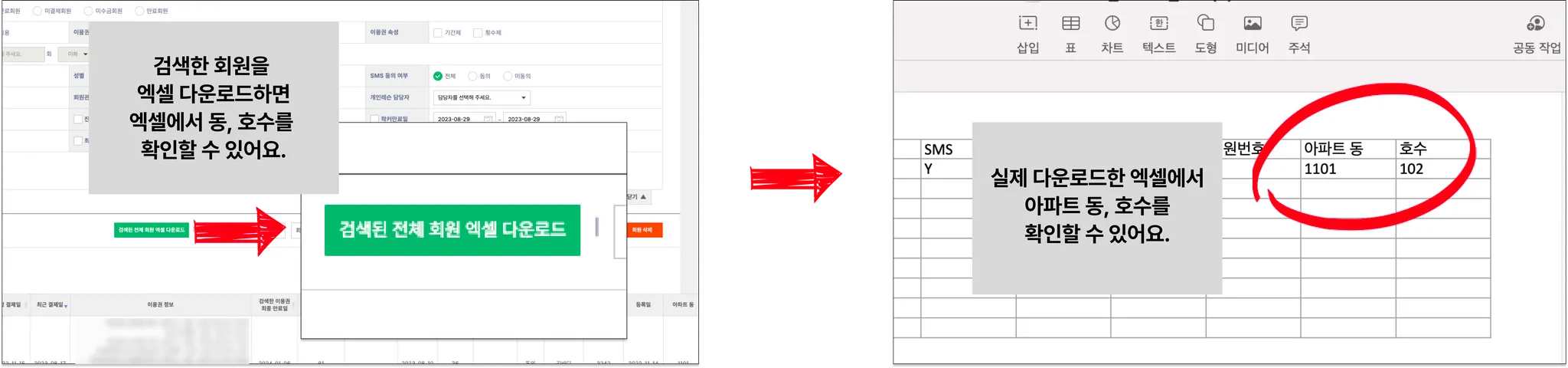 2. 회원 검색 및 조회 시 아파트 동, 호수 확인 및 엑셀 다운로드 지원