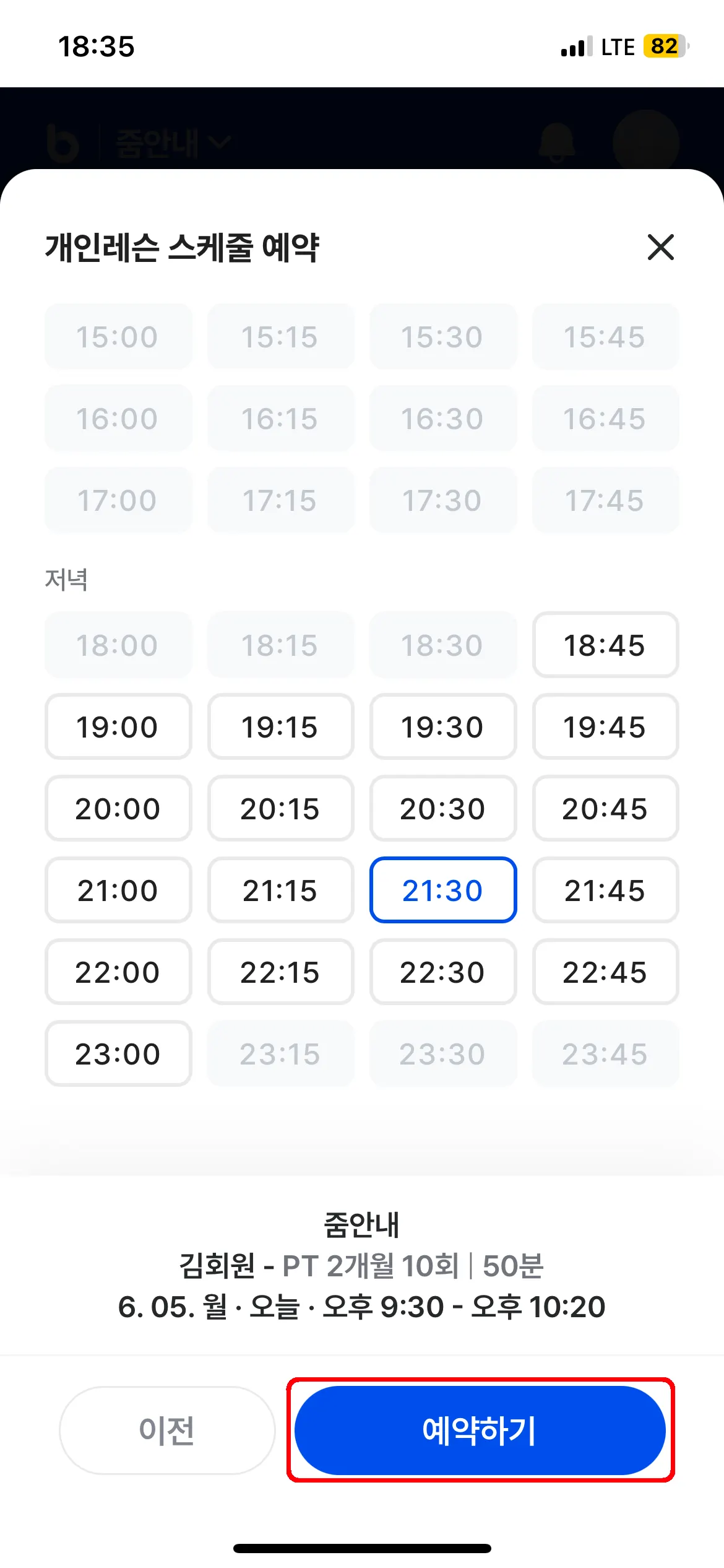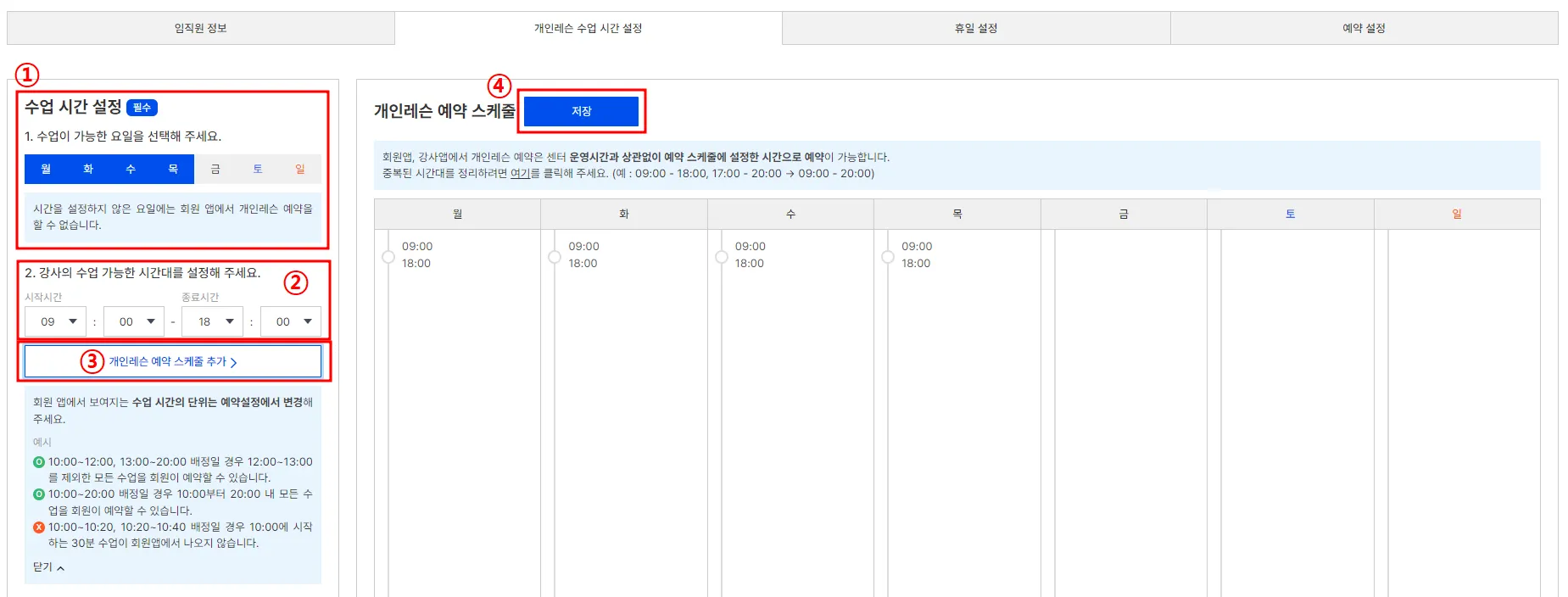 > 저장까지 완료해주시면 개인레슨 예약 가능한 시간대가 보일거예요!
