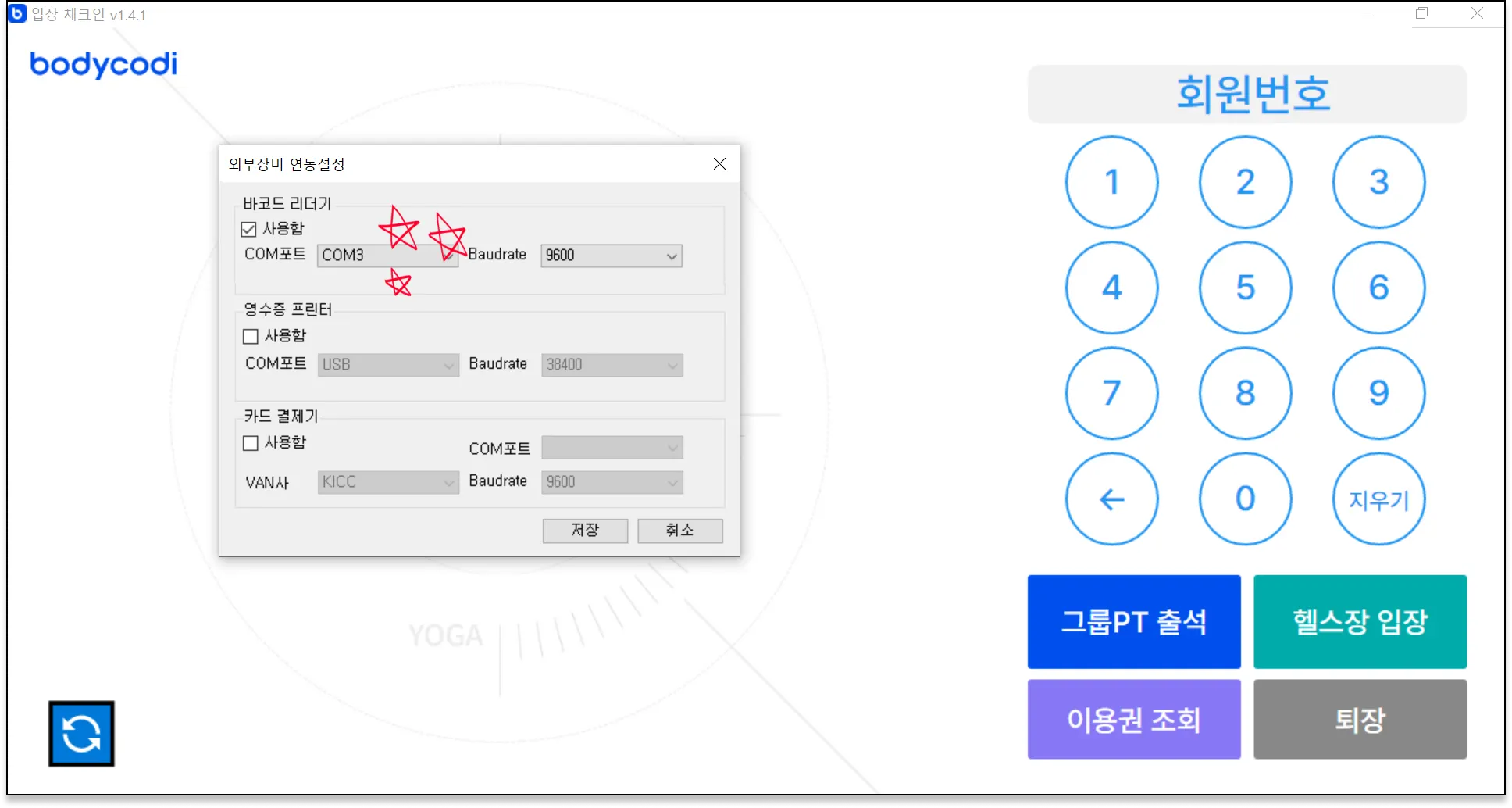 외부장치 연동설정 창에서 바코드 리더기를 ‘사용함'에 체크해주세요.