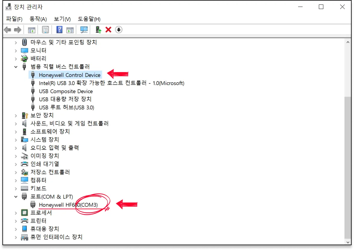 포트 (COM & LPT)에 Honeywell HF680이 나오는지 확인해주세요.