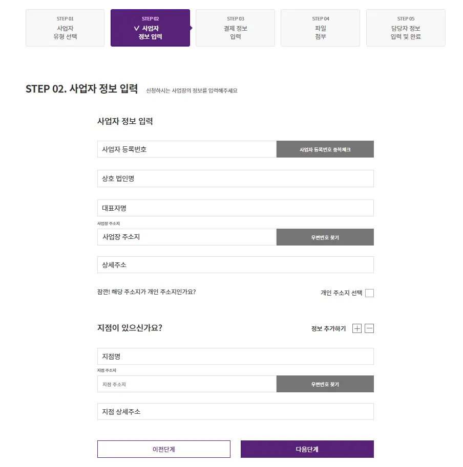 3 . STEP 02. 사업자 정보 입력을 합니다.