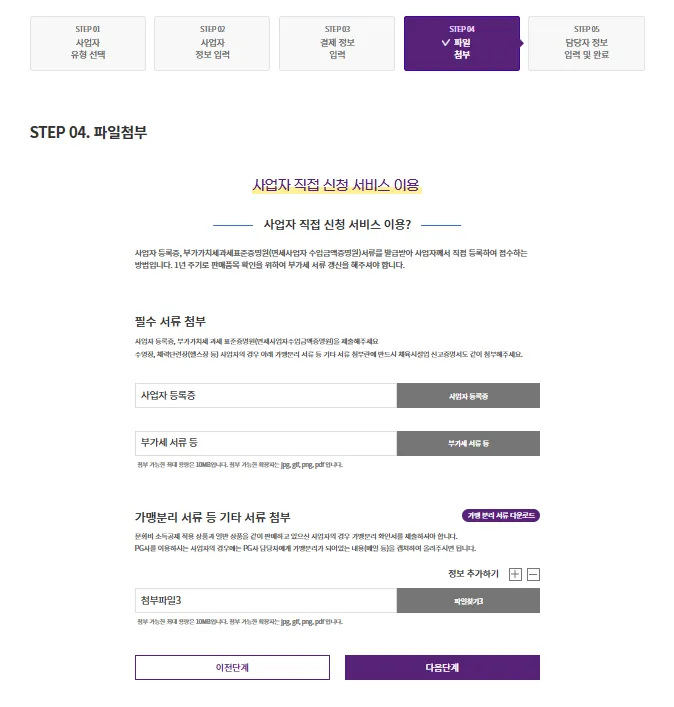 사이트에 접속하시기 전에는 사업자등록증/1년치 매출이 나온 부가가치세 과세표준증명서/가맹 분리 서류를 준비해주세요!