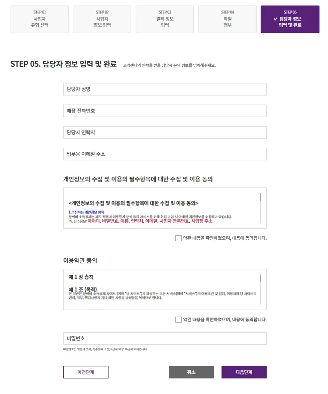 담당자 정보 입력 후, 이용약관 및 개인정보 수집에 동의하면 사업자 신청이 완료됩니다.