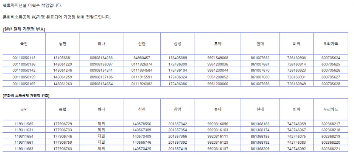카드 가맹점 번호는 위 이미지를 참고해 입력해주세요. 각 카드사 번호체계도 확인해주셔야 합니다!