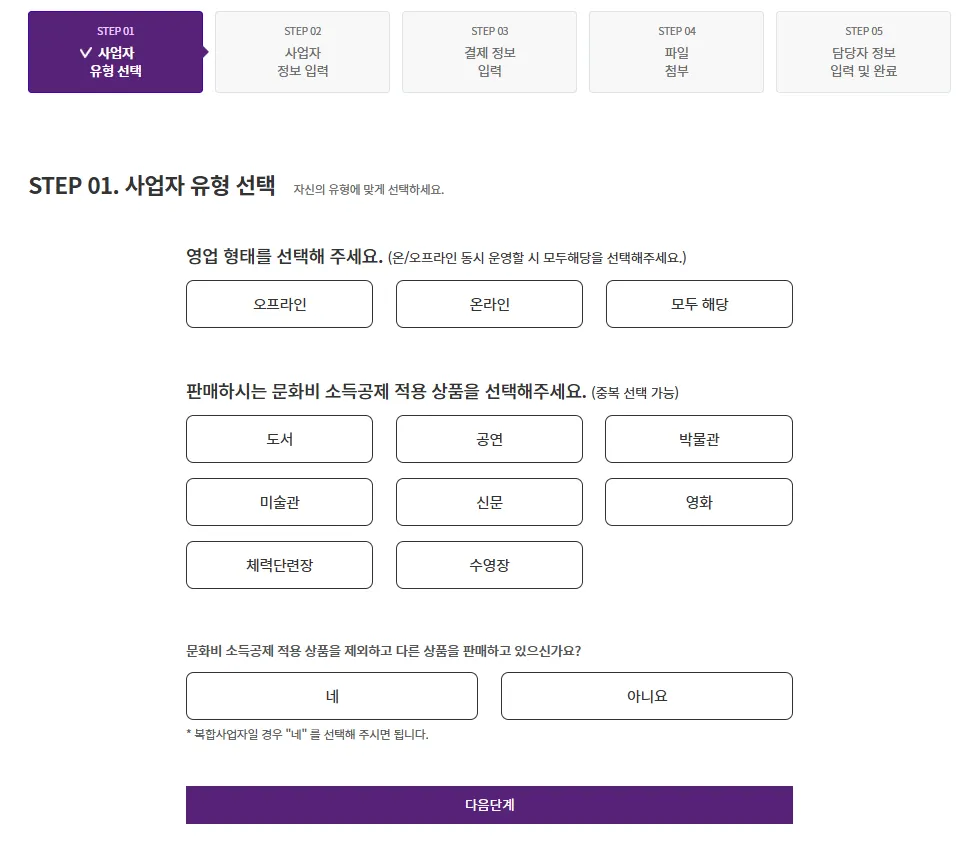 해당하는 유형을 선택해주시고 다음 단계로 넘어가주세요.