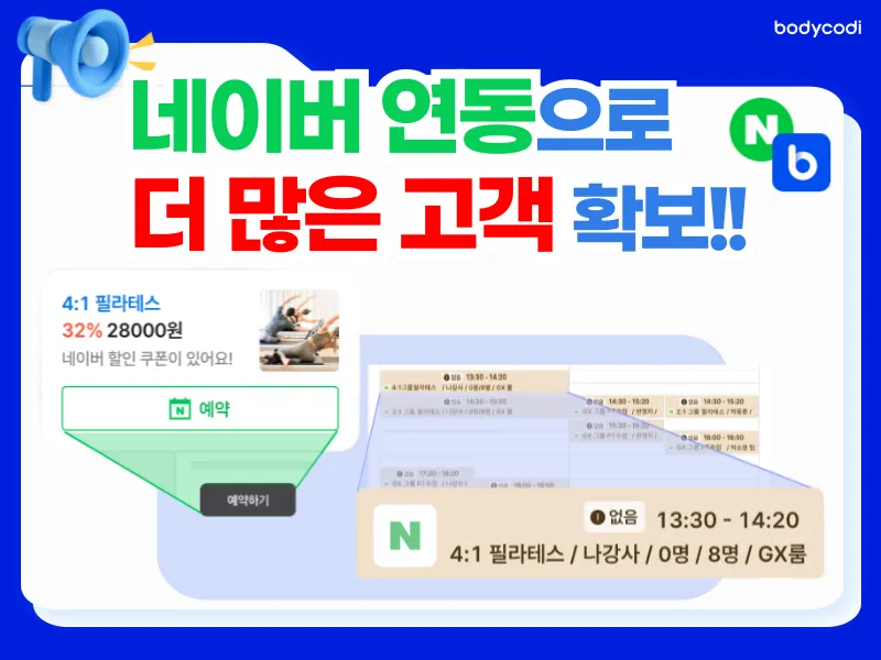 네이버 예약은 1회성 예약을 받게 됩니다. 예약자는 바디코디 스케줄러에서만 확인 가능하며, 바디코디 내 회원으로 관리를 원하신다면 회원정보는 별도로 등록해주셔야 합니다.