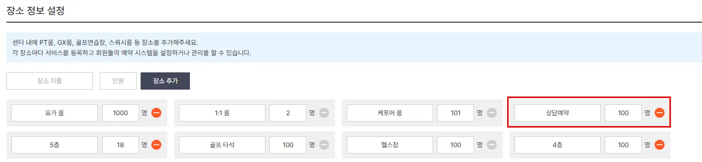센터관리 > 센터설정 > 장소정보설정에서 “상담예약” 장소를 추가 후 저장해주세요 .