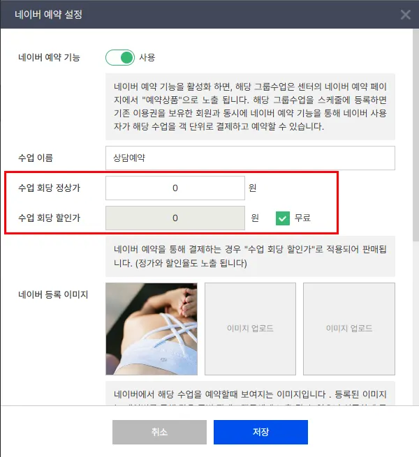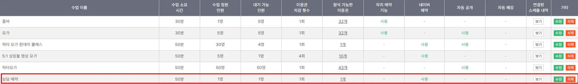 네이버 연동 수업은 상담예약과 같은 무료 상품들도 등록이 가능합니다.