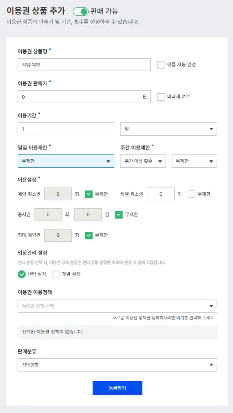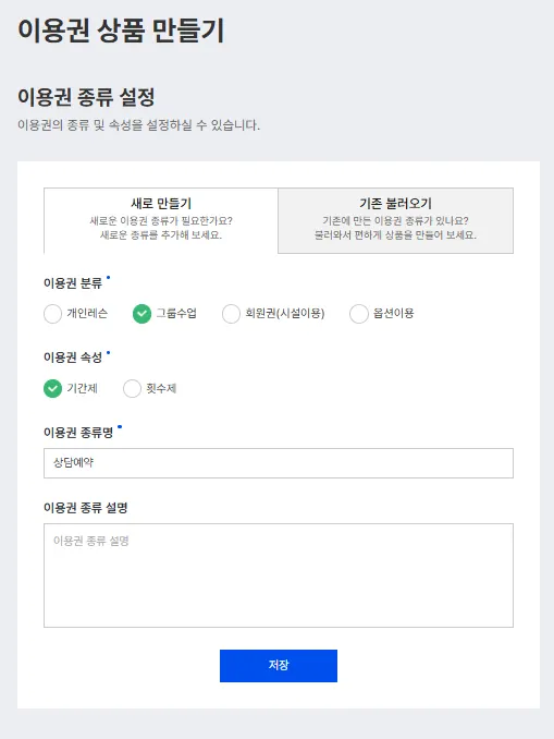 1. 이용권관리 > 현장판매이용권 > 이용권 상품 만들기 > 새로 만들기에 아래 내용과 같이 적어주세요.