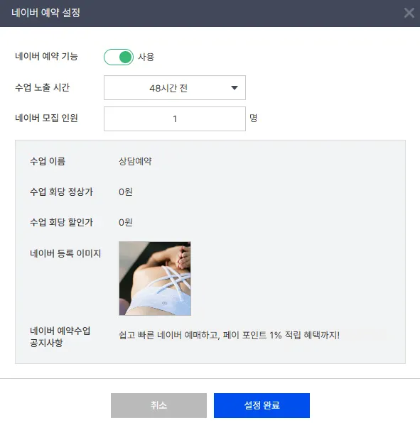 수업 등록시 수업 시작시간 기준 노출되는 시간과 네이버로 모집할 인원을 설정할 수 있어요.