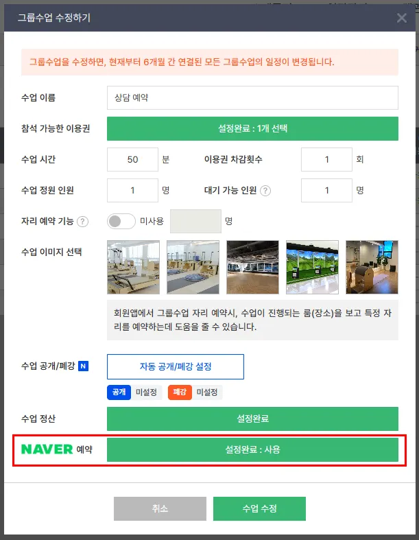 스케줄러 > 그룹수업 관리 > 새로운 수업 등록 혹은 기존 수업 ‘수정’ > 네이버 예약 ‘설정하기’를 선택해주세요.