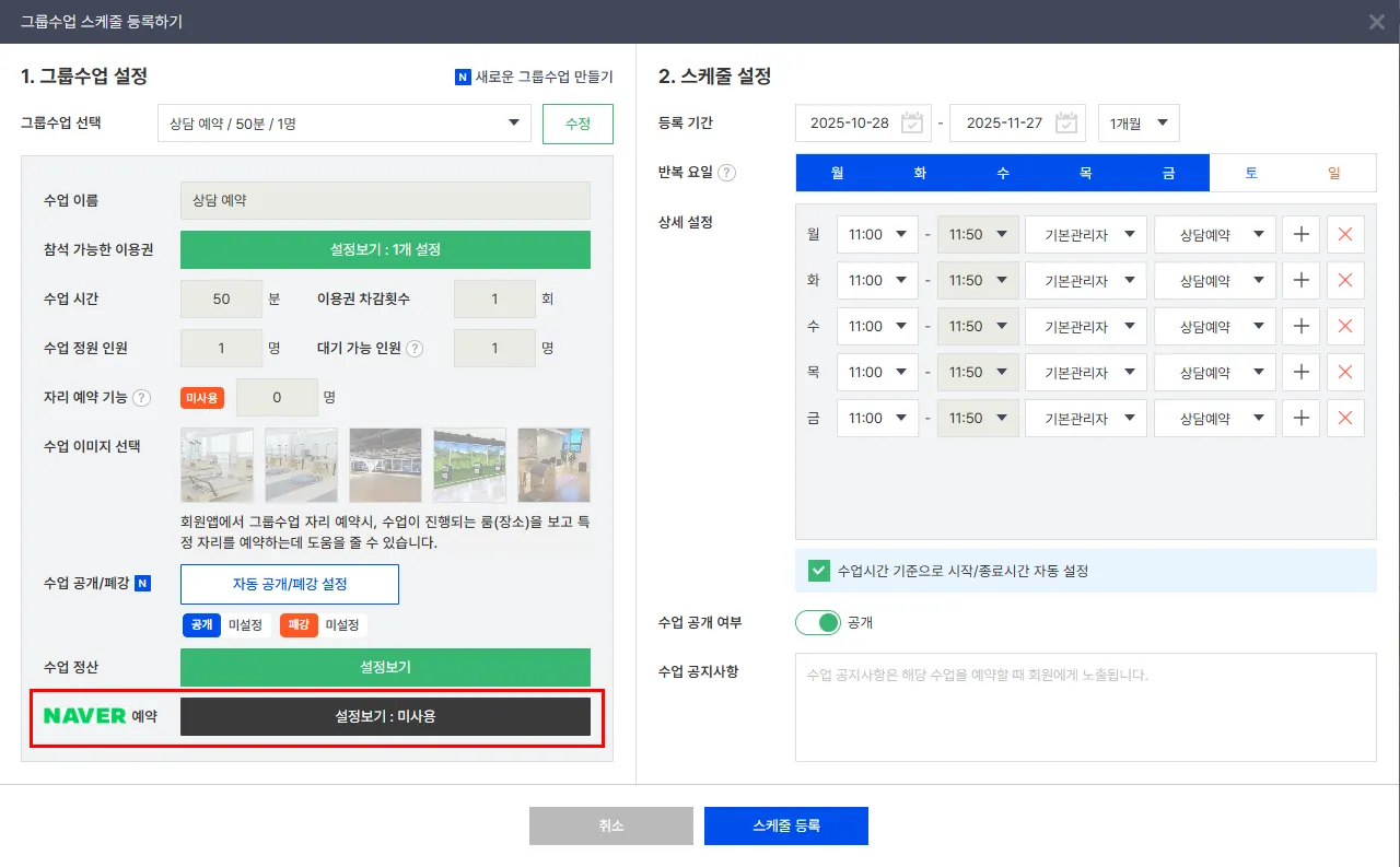 스케줄러 > 그룹수업 스케줄에서 네이버로 예약받을 스케줄을 등록해주세요.