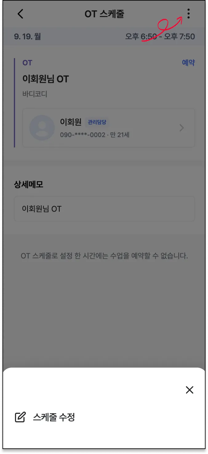 OT, 상담 예약은 강사의 이용권 구매 회원, 또는 관리담당 회원만 OT, 상담 스케줄을 예약할 수 있습니다.