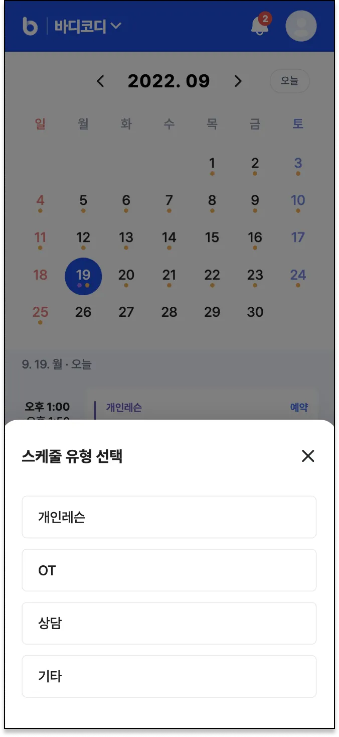 개인레슨 예약과 마찬가지로, 스케줄 유형 선택에서, ‘OT’ 또는 ‘상담’을 누르면 스케줄을 예약할 수 있습니다.