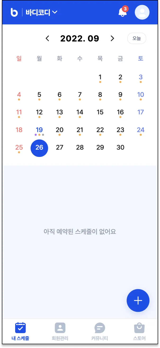 그 날에 최소 1개 이상의 해당 스케줄이 있다는 표시에요. 개인레슨 1회, 그룹수업 3회면 보라색, 주황색 점이 하나씩 등록됩니다. 그 날의 수업을 빠르게 확인할 수 있어요!