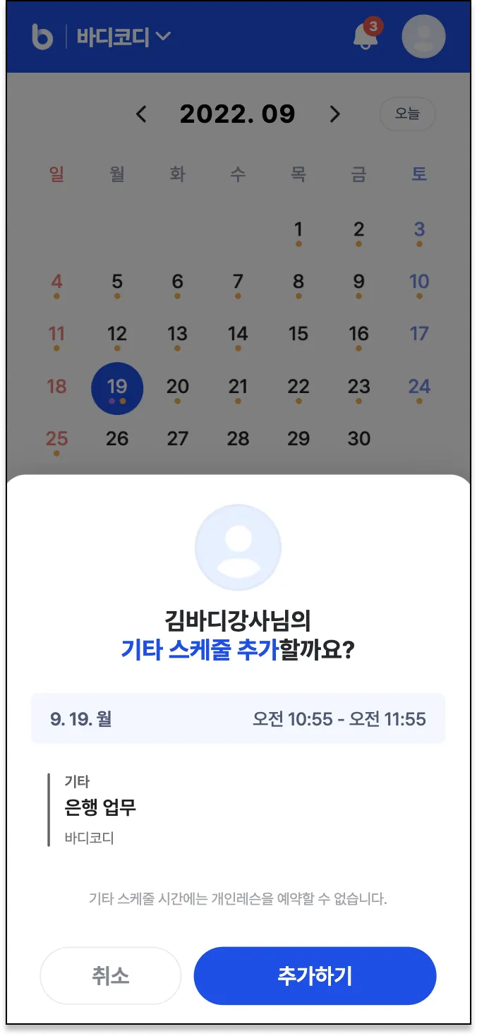 예약하려는 시간에 스케줄이 있다면, 예약할 수 없습니다.
