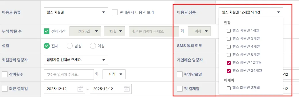 예) 헬스 장기권 구매하신 회원님 일괄 검색