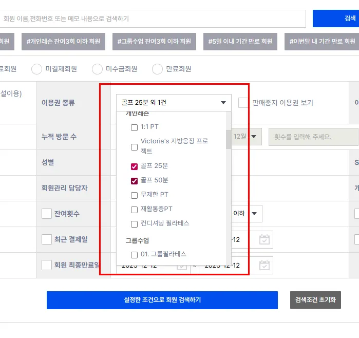 이제 회원 검색 시 ‘이용권 종류’와 ‘이용권 상품’을 여러 개 동시에 선택하여 검색하실 수 있습니다.