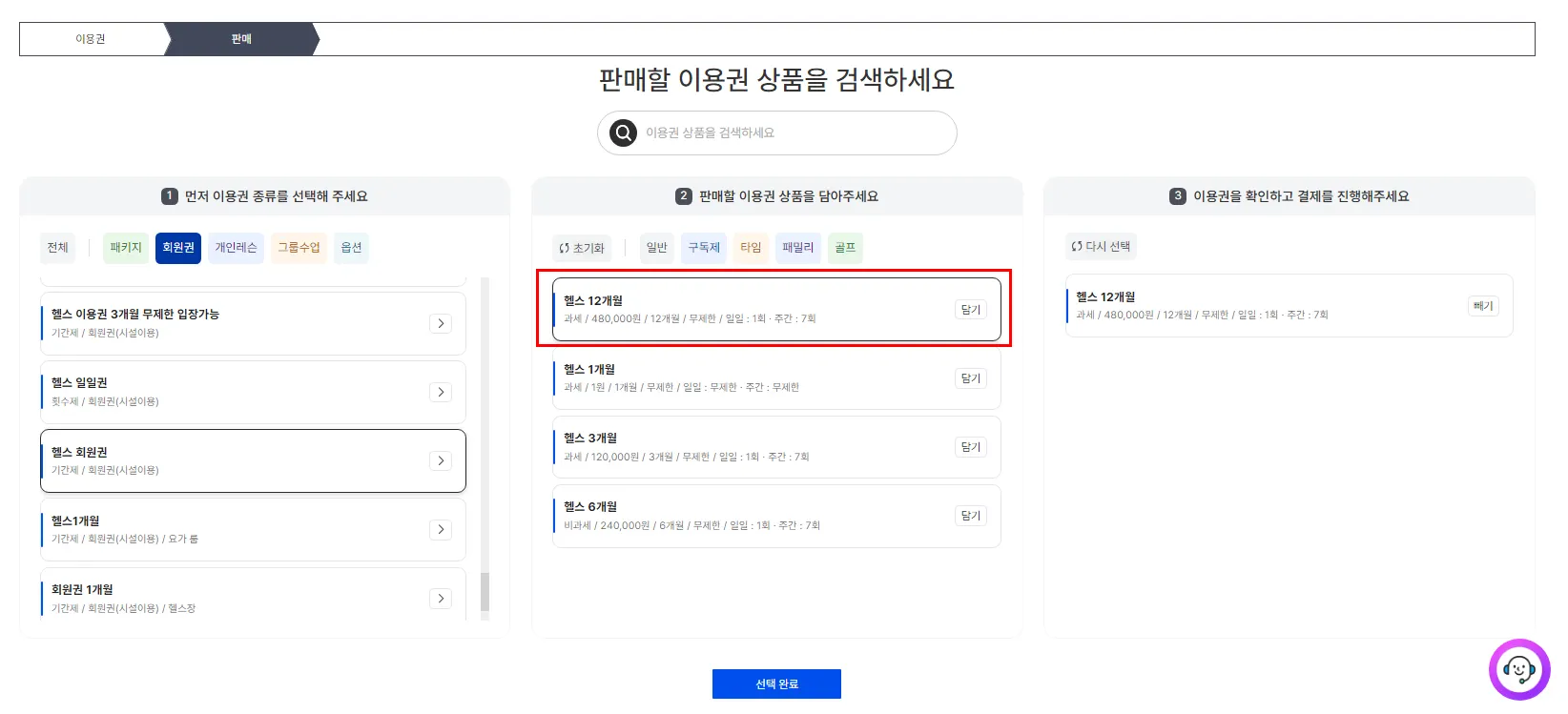 판매할 이용권 선택 > 시설 이용권 (회원권) 선택 > 판매
