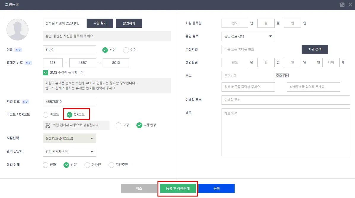 회원등록 > 센터 관계자를 회원으로 등록 > QR 체크 > 등록 후, 상품 판매