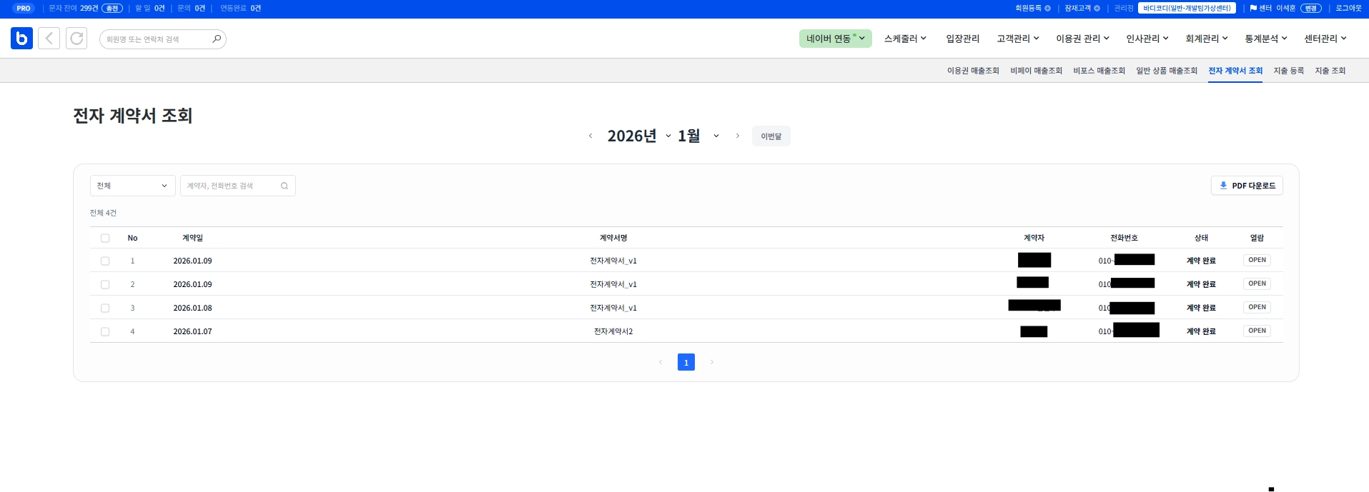 센터에서는 작성된 계약서를 회계관리 > 전자계약서 조회에서 일자별로 조회하실 수 있습니다.