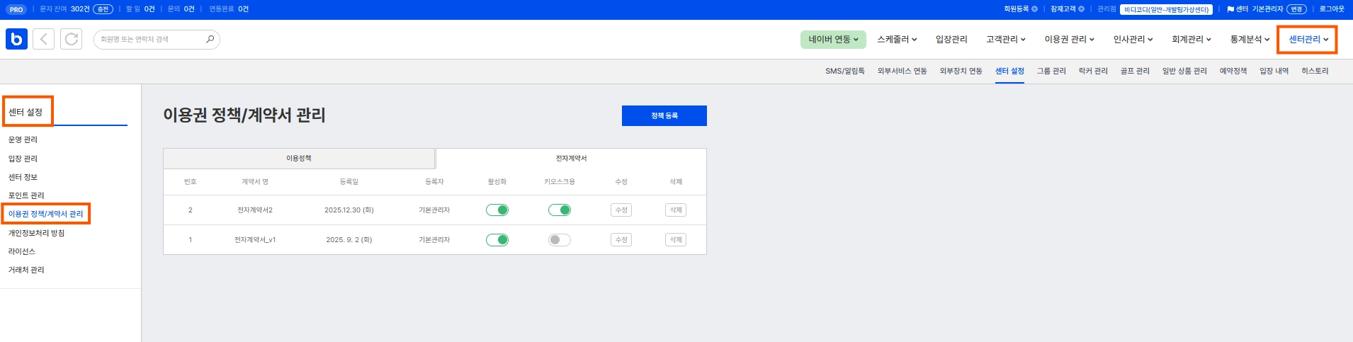 ‘센터관리 > 센터설정 > 이용약관/계약서 관리’로 들어가면 전자계약서 등록 및 활성화가 가능합니다.