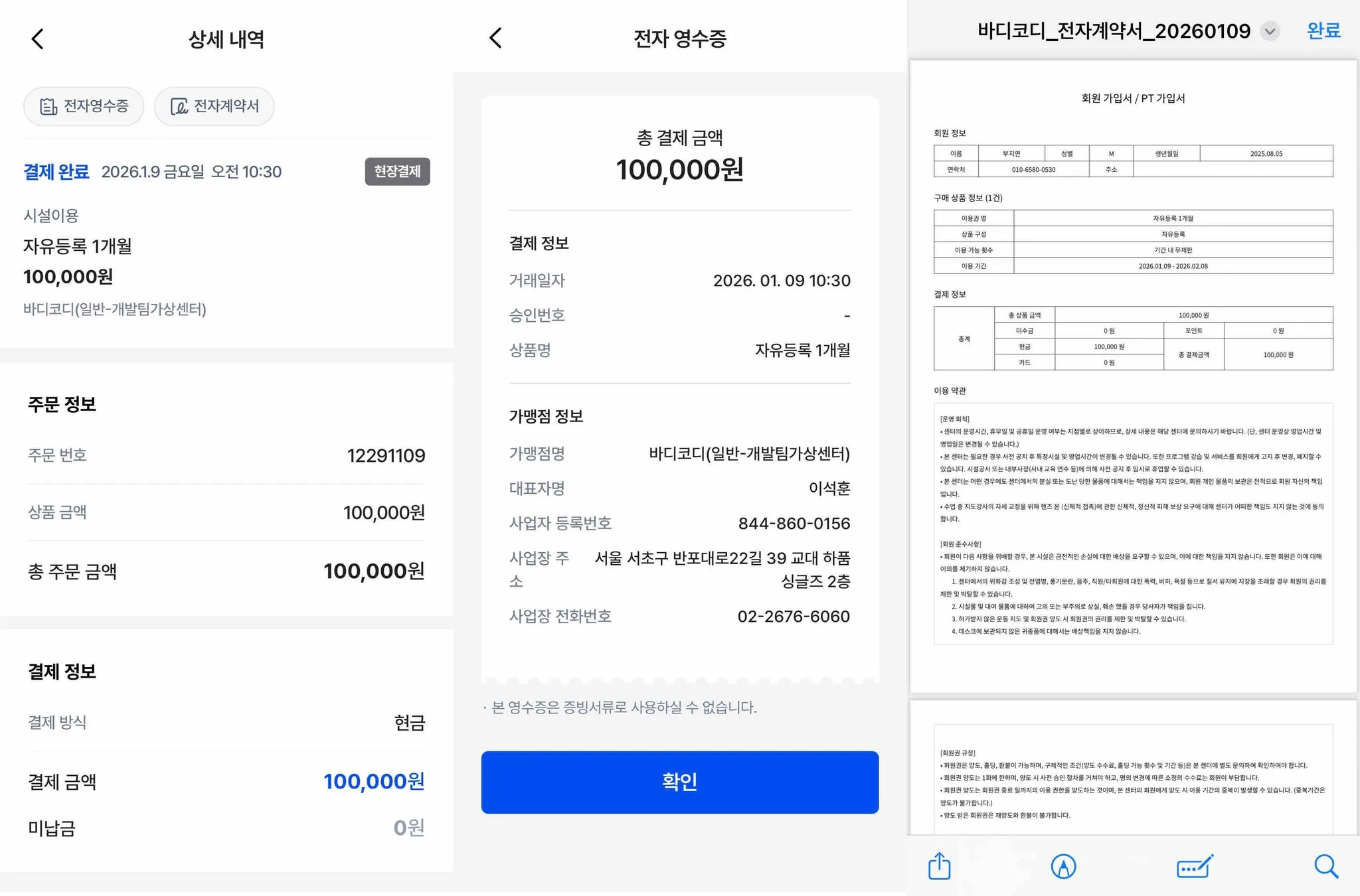 회원님께서 전자계약서를 회원앱 (’우측상단 프로필 클릭 > 결제내역 > 현장판매 >내역 클릭’)으로 확인하실 수 있습니다.