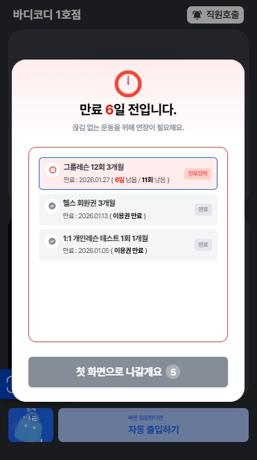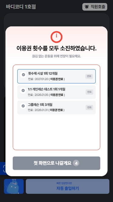 잔여횟수 3회 이하 남았거나, 시설이용권의 당일 사용이 종료될 경우