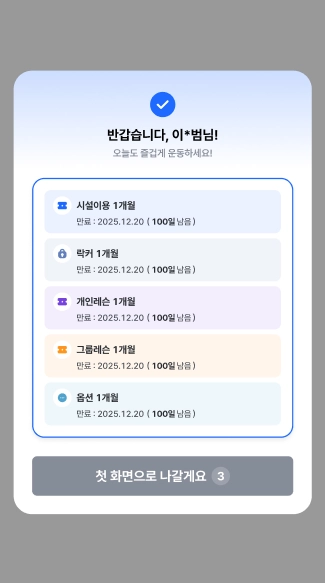 이용권으로 입장 시도 시 혹은 일일권 구매 후 입장 시 아래와 같은 입장 성공 알림이 떠요.