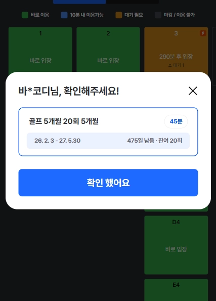 타임 이용권으로 설정된 경우, 설정된 이용 시간 외에는 입장 및 타석 배정이 제한되며