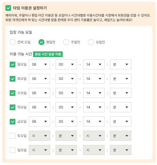 이용권관리 > 현장판매/b.pay이용권 > 수정하기 혹은 이용권 상품만들기에서 “타임 이용권”을 설정해주세요