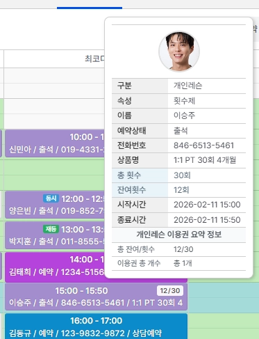 PC 개인레슨 스케줄에서 회원님 전체횟수/잔여횟수를 바로 확인할 수 있도록 업그레이드 되었어요!