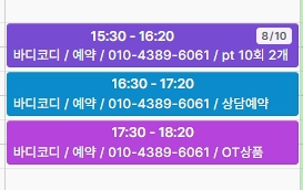 뿐만 아니라, 개인레슨 / 상담예약 / OT상품도 한 번에 구분 가능하도록 “OT상품”의 색상을 변경하였어요.