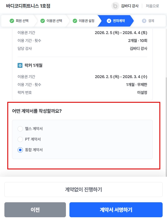 등록된 전자계약서가 없다면, PC > 센터관리 > 센터설정 > 이용권정/계약서관리에서 전자계약서를 등록해주세요. (상세매뉴얼 전자계약서 등록 방법 보러 가기! )