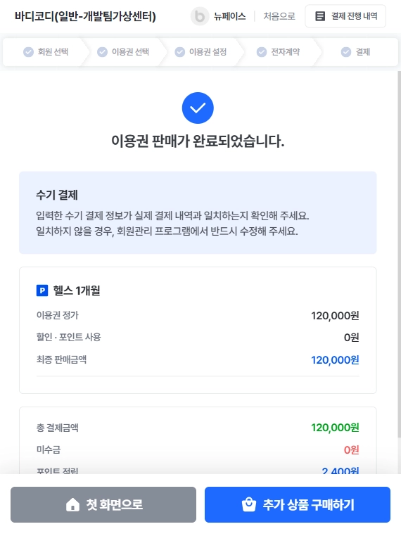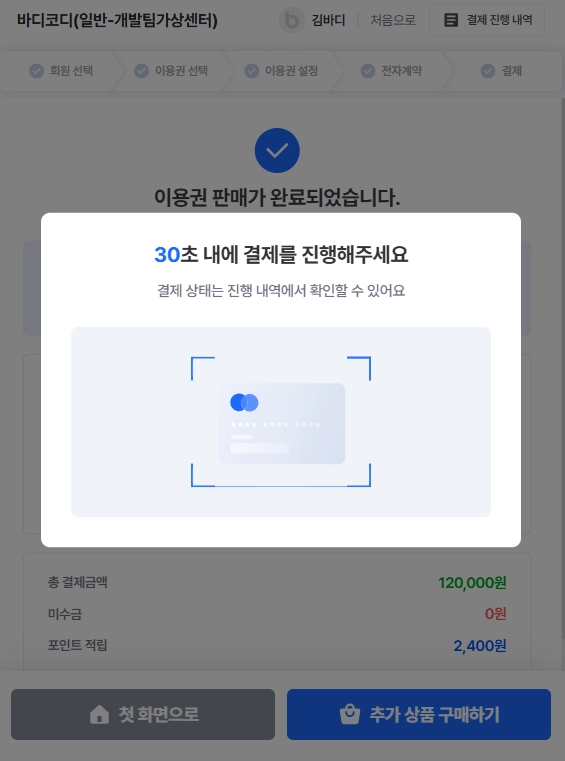 아래화면이 뜬다면 끝! 바디코디 PC프로그램에서도, 회원앱에서도 내역을 확인할 수 있어요 (결제 이외의 환불, 양도 업그레이드 등은 바디코디PC에서 진행 가능해요)