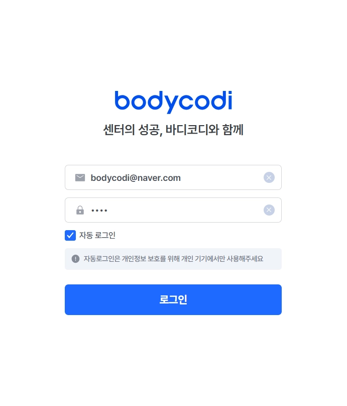 아래와 같이 로그인 창이 뜨면, 기존 바디코디 로그인 아이디와 동일하게 기입해주세요. (PC랑 동일 계정이라 헷갈릴 일 없어요 )