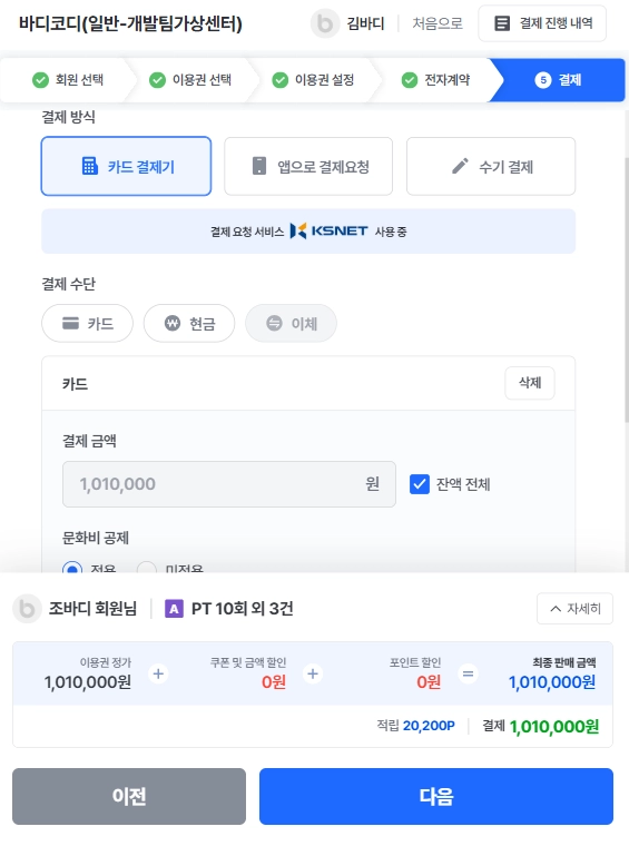 카드결제기 : 바디코디와 연동된 카드단말기로 바로 결제가 가능해요 (카드,현금)